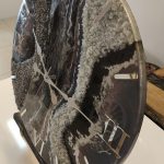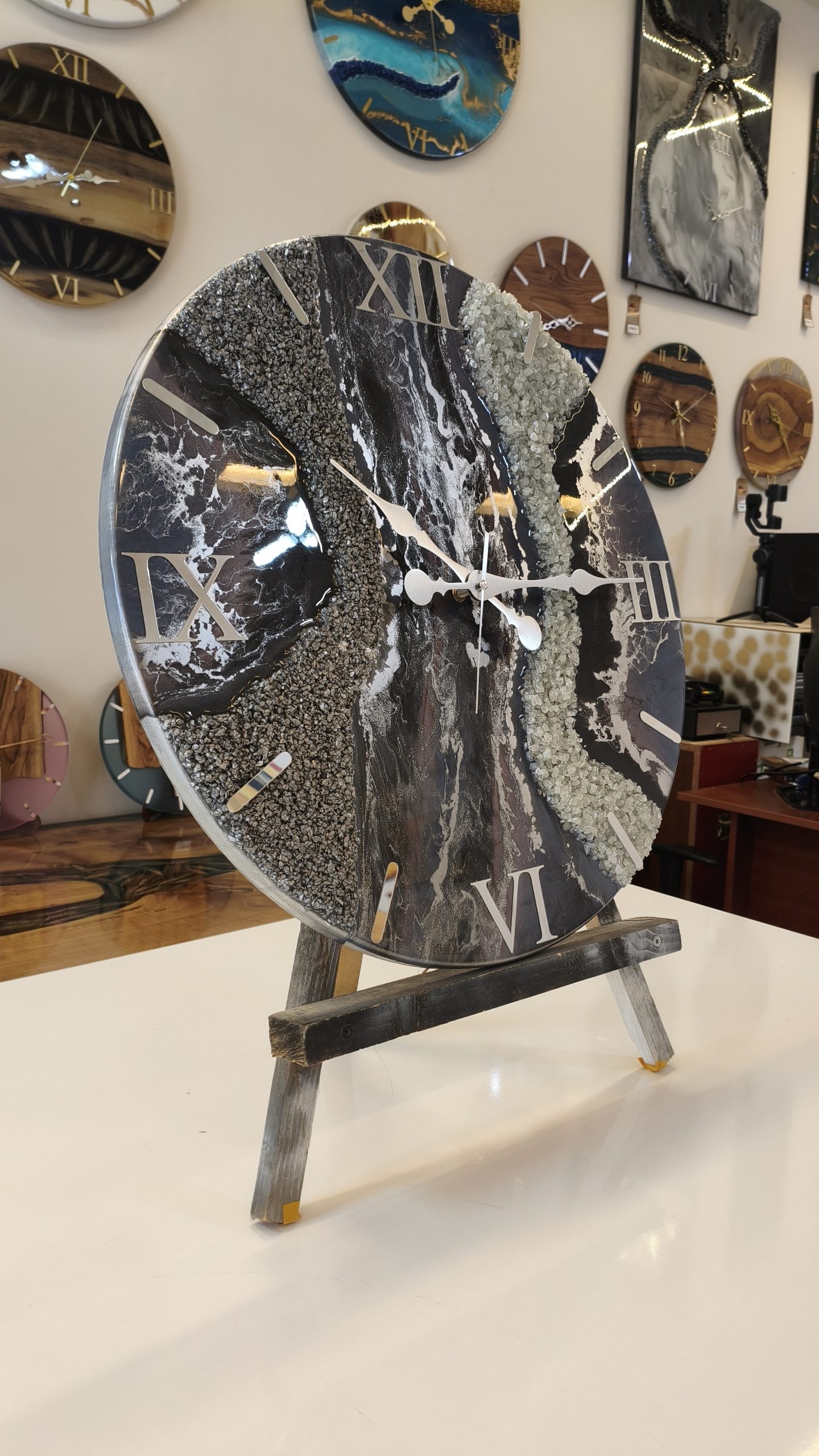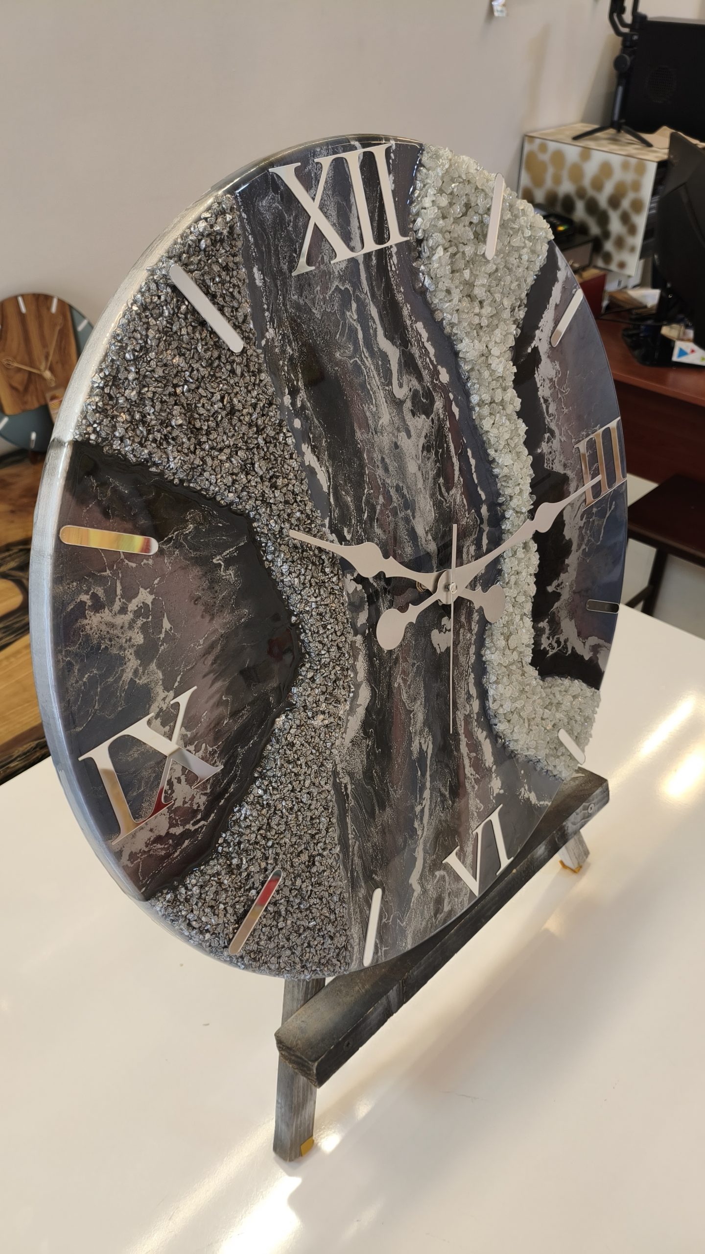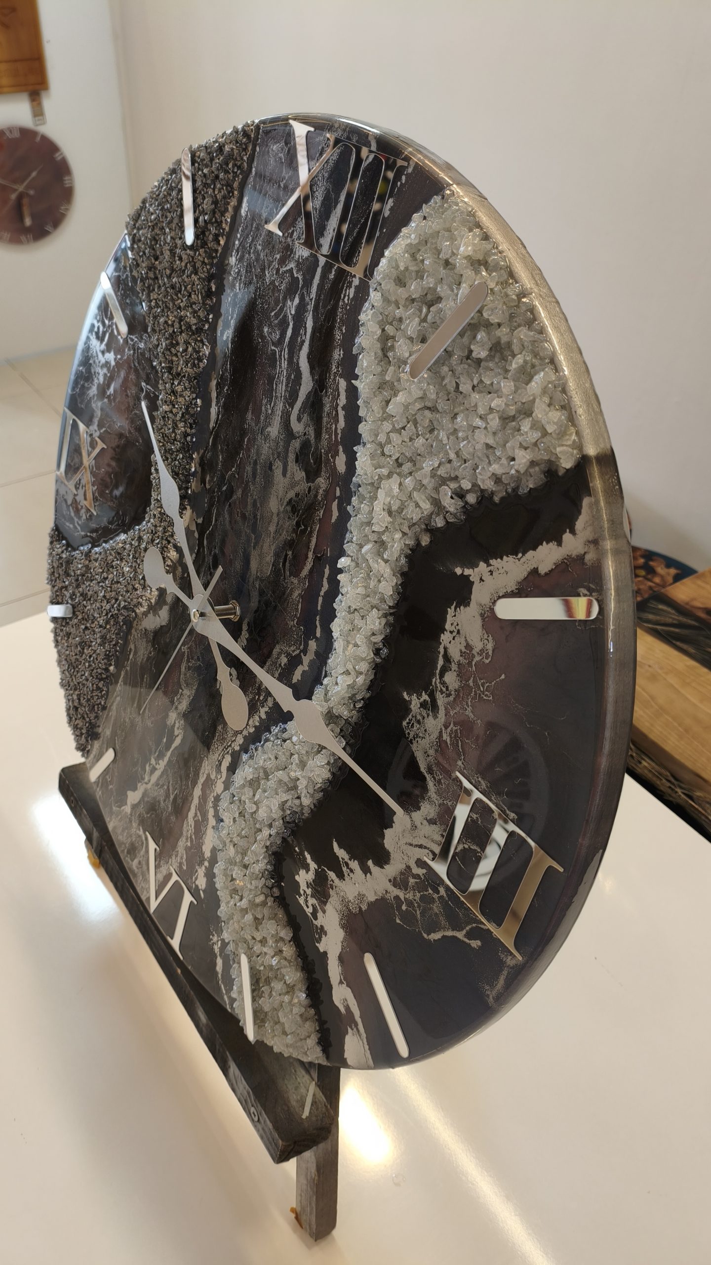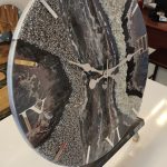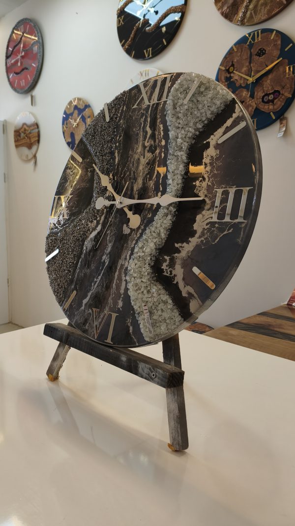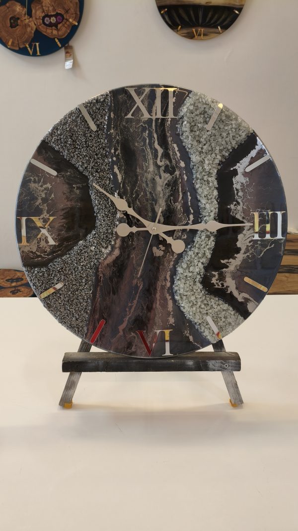 Doğal mermer dokusunu andıran gri tonları ve lila tonlarıyla tasarlanan bu özel epoksi duvar saati, bulunduğu ortama sofistike ve prestijli bir hava katar.
